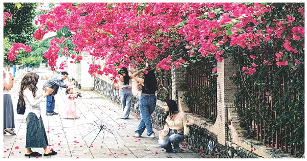 近日,七星区毛塘路一片三角梅绚烂开放,吸引了不少人前来欣赏。其中两位市民选择了类似的姿势与花朵合影,似乎很有默契。 记者邢刚 摄