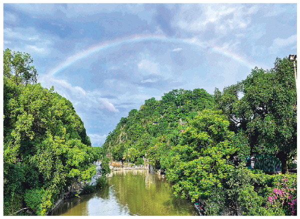 昨天傍晚,一场大雨过后,市区出现了彩虹。图为在文昌桥附近拍到的景象。 记者滕嘉 摄