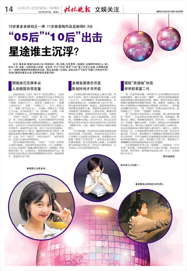 星途谁主沉浮?   近日,黄多多(黄磊与孙莉之女)将搭档王一博、汤唯、王传君等一线演员,出演程耳电影《人·鱼》的女二号,消息一出即刻登上热搜。近些年,不少“05后”甚至“10后”星二代年少出道,以网络为助力,一进娱乐圈便自带话题和关注度。跟过去的星二代相比,这些出生于“Z世代”的星二代有何不同?在他们面前的星光大道,是更崎岖还是更闪亮?