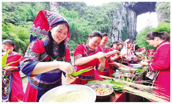 5月23日,在广西罗城仫佬族自治县怀群镇天门山景区,游客与村民在参加包粽子比赛。