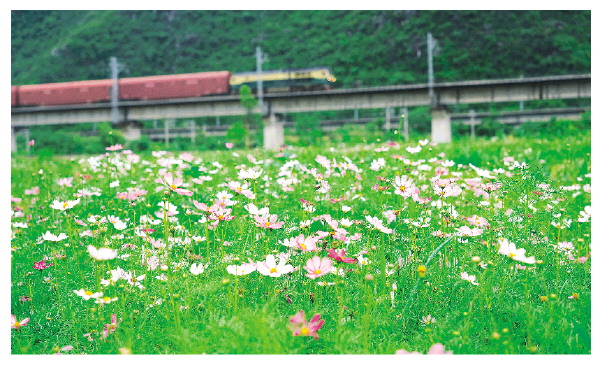 抬眼望去,不远处连绵起伏的青山下是湘桂铁路和衡柳铁路,不时有列车呼啸而过。若是拍照时放低镜头,便能捕捉到火车从格桑花海中穿梭而过的绝美画面。
