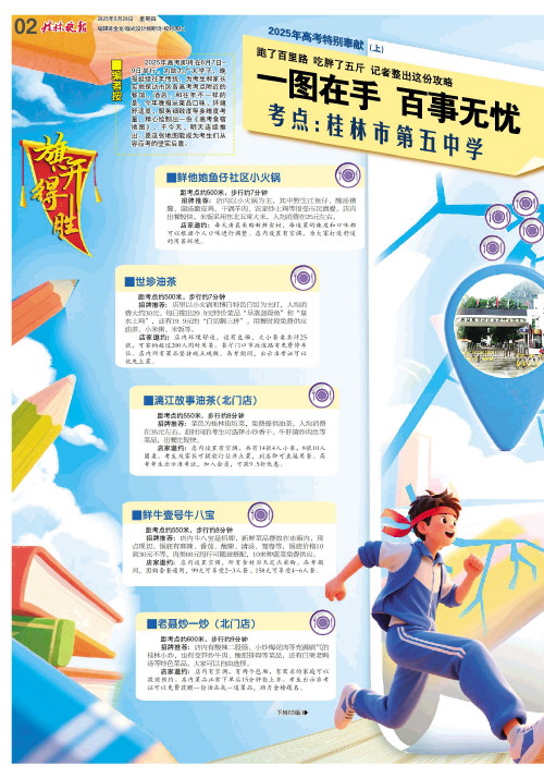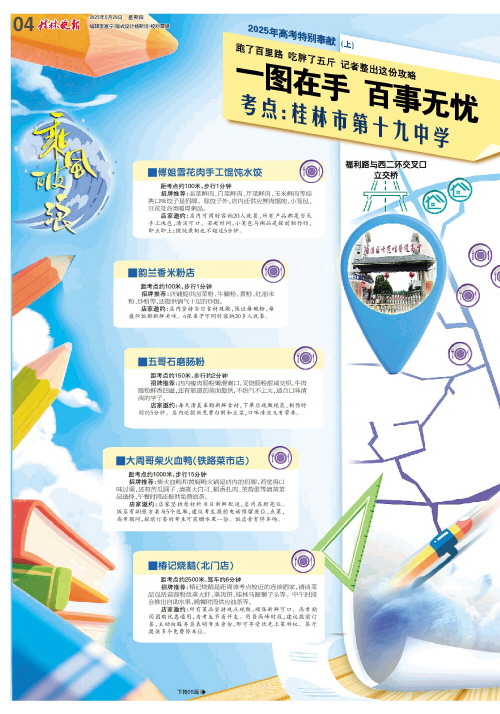 2025年高考即将在6月7日-9日举行。为助力广大学子,晚报延续往年传统,为考生和家长实地探访市区各高考考点附近的餐馆、酒店。和往年不一样的是,今年晚报从菜品口味、环境舒适度、服务细致度等多维度考量,精心绘制出一份《高考食宿地图》,于今天、明天连续推出。愿这张地图能成为考生们从容应考的坚实后盾。