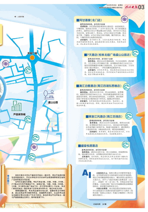 AI建议住哪里:考点周边酒店资源相对有限,步行或短途出行范围内的最优选择为7天酒店(桂林北极广场虞山公园店)和漓江泊雅酒店(两江四湖东西巷店)。