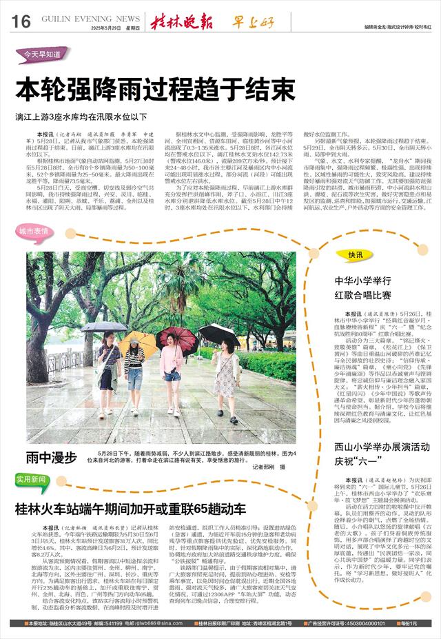 本轮强降雨过程趋于结束 漓江上游3座水库均在汛限水位以下   本报讯(记者马翔 通讯员阳薇 李勇军 申建军)5月28日,记者从我市气象部门获悉,本轮强降雨过程趋于结束。目前,漓江上游3座水库均在汛限水位以下。
