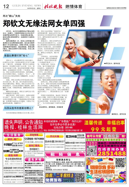 法网之后,郑钦文将进入草地赛季的备战。如今,郑钦文的发球已经逐渐被越来越多对手所熟悉,如果还是依靠“一招鲜”,想要在竞争激烈的女子网坛更进一步,恐怕不是易事。分析人士认为,郑钦文最需要完成的功课之一,便是更新自己的“武器库”。