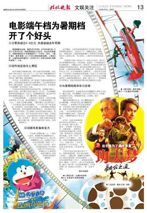 开了个好头 三日票房超过4.6亿元 热度超越去年同期   根据猫眼专业版,截至6月3日8时,2025年端午档(5月31日至6月2日)电影票房超过4.6亿元,较去年热度提升,回暖的票房为今年暑期档开了一个好头。其中,《碟中谍8:最终清算》以1.91亿元票房领跑档期,《哆啦A梦:大雄的绘画奇遇记》《时间之子》分别位居端午档票房榜第二、三名。