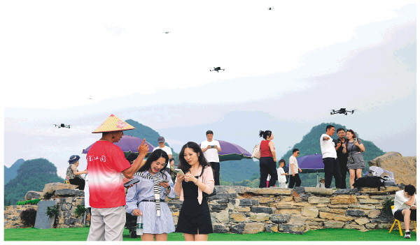 近日,在阳朔县葡萄镇杨梅岭村的千里江山图打卡点,多位游人为了从更好地角度拍照,放飞无人机航拍,一时间不大的空域就聚集了多架无人机。 记者邢刚 摄