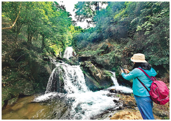 近段时间,临桂区五通镇白马村的白马瀑布在网上走红。该瀑布由多级组成,虽然落差不大,但它的形态优美,清澈的溪流从峡谷间倾泻而下,形成了多道美丽的水幕。瀑布周边植被繁茂,绿树成荫,清凉宜人,是夏日避暑的绝佳去处。图为一市民在拍摄白马瀑布。记者邢刚 摄