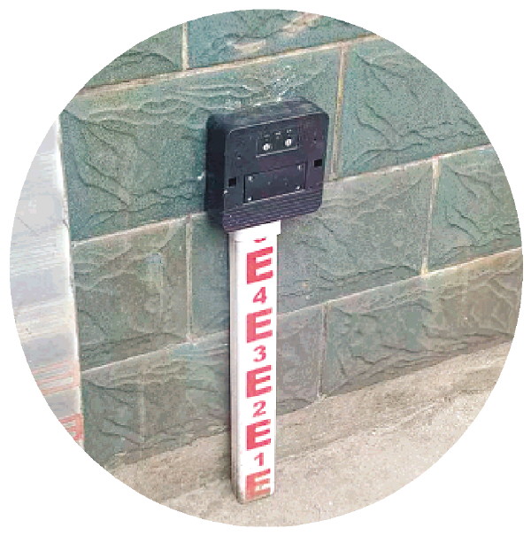 这些装置由一个方盒子和一个水位标尺组成,看似简单,但它们可以24小时不间断监测地面积水深度,当水位触及预设刻度,设备内置的传感器即刻被唤醒,并通过物联网平台将警报信息实时推送到交警指挥中心、保险公司应急小组及相关部门人员的手机上。