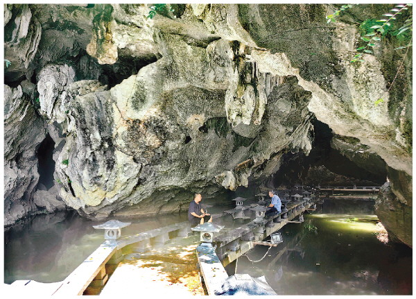 6月12日中午,两位市民在临桂区环城水系的玉壶山岩洞避暑纳凉。玉壶山植被茂盛,山脚有一个岩洞,水流从岩洞中蜿蜒而过。夏日洞里凉风习习,是周边居民避暑的好去处。 记者邢刚 摄