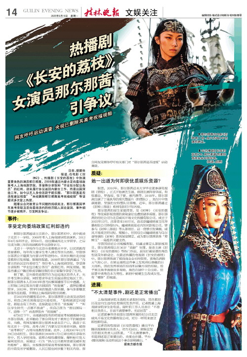 日前,据媒体报道,在电影《封神2》、热播剧《长安的荔枝》中饰演重要角色的演员那尔那茜,2008年通过内蒙古定向委培政策考入上海戏剧学院,享受降分录取和“毕业包分配公务员”的红利,却未履行协议返回内蒙古工作,而是出国深造三年,如今以艺人身份活跃于娱乐圈。“那尔那茜是否违规建议彻查”“央视删除那尔那茜高考祝福视频”等话题词多次登上热搜。