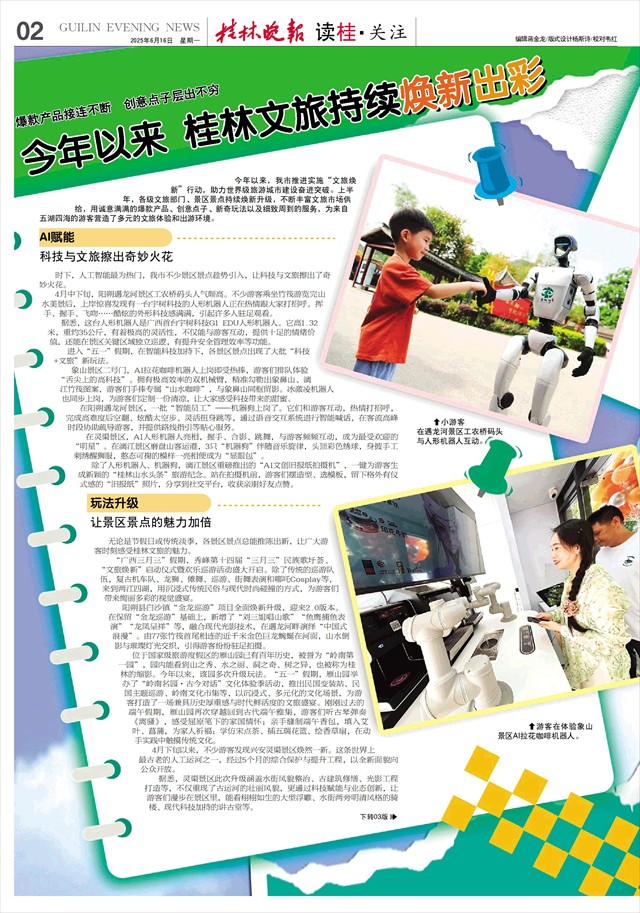 除了人形机器人、机器狗,漓江景区重磅推出的“AI文创旧报纸拍摄机”,一键为游客生成新颖的“桂林山水头条”旅游纪念。站在拍摄机前,游客们摆造型、选模板,留下格外有仪式感的“旧报纸”照片,分享到社交平台,收获亲朋好友点赞。