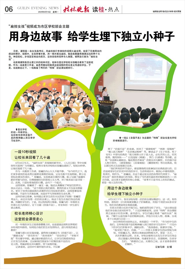 “我们所有的环节设计,都是围绕现实故事加历史典故进行的。目的是希望学生们在初中阶段的学习、生活和成长中,做到心中要有理想、有责任、有担当。”张曦说,在这个被过度关注的高考时代背景下,“扁担女孩”独自负重前行的身影,照见了当代青年最珍贵的精神底色——自立自强,这应该才是教育的核心命题,“高考不只是书本上的知识测试,更是一场人生的历练。”