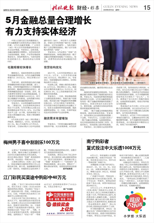 有力支持实体经济   中国人民银行近日发布数据显示,5月金融数据与实体经济运行情况合理匹配,5月社会融资规模、广义货币(M2)和人民币贷款增速均明显高于名义GDP增速。专家表示,总体来看,金融总量继续合理增长,支持实体经济力度保持稳固。财政、产业等宏观政策靠前发力、更加积极有为,与货币政策形成更强合力,推动经济运行持续向好。