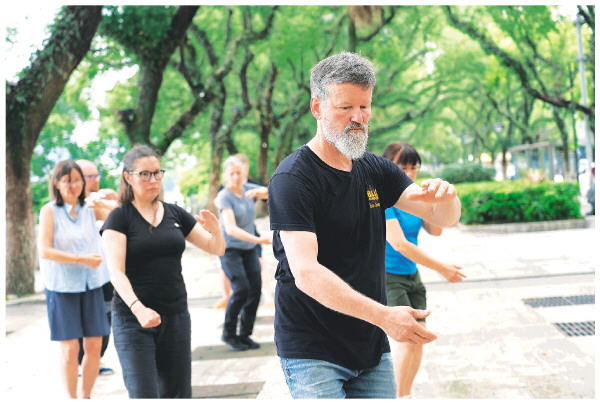 6月18日上午,几位外国游客在滨江路练习打太极拳,在青山绿水间感受中华武术的魅力。据了解,这些游客来自芬兰、挪威等欧洲国家,这几天他们游览了漓江、象鼻山、七星岩、龙脊梯田等景区景点。 记者邢刚 摄