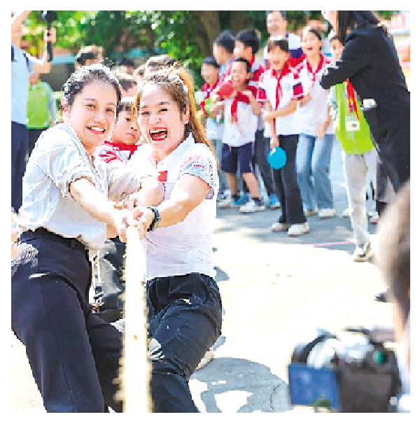 世界冠军杨森莲参加快乐操场活动,与孩子们拔河互动。