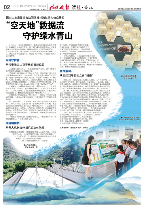 守护绿水青山   6月25日,在阳朔县双滩村,骤雨过后的漓江水流有些湍急。距离漓江10米内伫立着一座三层白墙灰瓦的小楼房,这里是国家生态质量综合监测站广西桂林漓江站(以下简称漓江站)。它于2021年建成,并于2023年11月纳入国家生态质量监测网。近日,漓江站首次对公众开放,吸引了不少学校、社会团体组织人员前来参观。