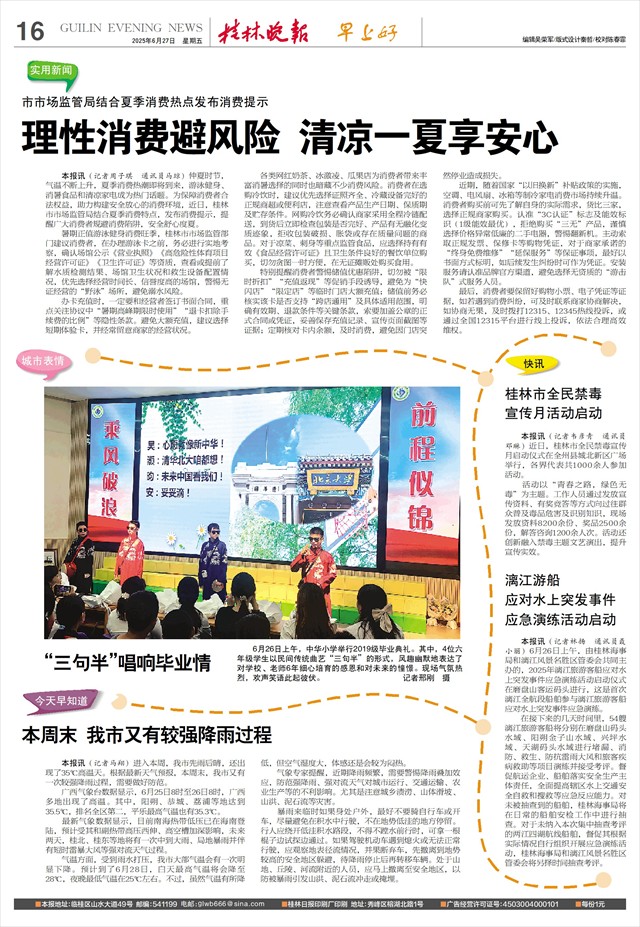 市市场监管局结合夏季消费热点发布消费提示 理性消费避风险 清凉一夏享安心   本报讯(记者周子琪 通讯员马琼)仲夏时节,气温不断上升,夏季消费热潮即将到来,游泳健身、消暑食品和清凉家电成为热门话题。为保障消费者合法权益,助力构建安全放心的消费环境,近日,桂林市市场监管局结合夏季消费特点,发布消费提示,提醒广大消费者规避消费陷阱,安全舒心度夏。