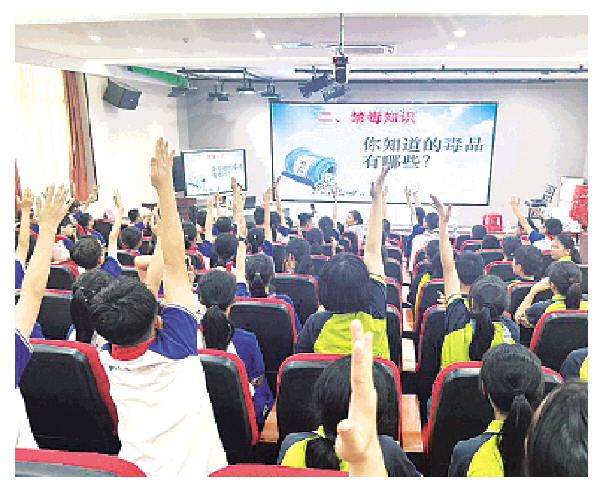 随后,广西第五强制隔离戒毒所的薛文静警长给学生们详细介绍传统毒品、新型毒品类型,揭开毒品伪装在“糖衣”下的狰狞面目,并且结合青少年涉毒案例,深入剖析毒品对个人身心健康、家庭和谐、社会稳定的严重破坏。薛文静还通过仿真毒品展示,让学生直观认识不同毒品,提升辨别能力,同时传授拒毒防毒方法,如不随意接受陌生人食物饮料、远离复杂场所等。学生近距离观察仿真毒品后深受触动,纷纷表示将坚决抵制毒品,守护健康人生。