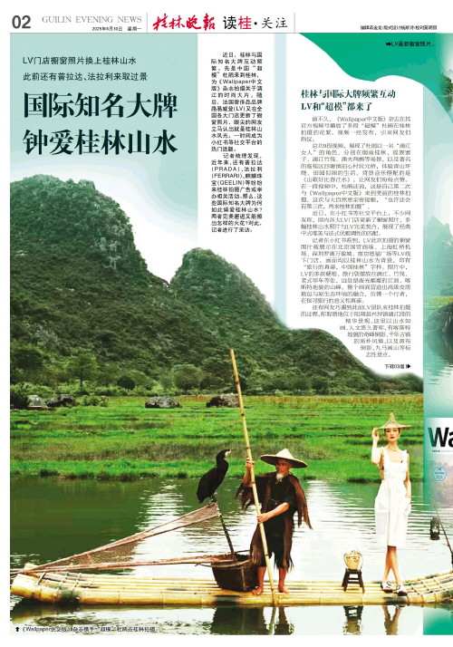 钟爱桂林山水   近日,桂林与国际知名大牌互动频繁。先是中国“超模”杜鹃来到桂林,为《Wallpaper中文版》杂志拍摄关于漓江的时尚大片。随后,法国奢侈品品牌路易威登(LV)又在全国各大门店更新了橱窗照片,眼尖的网友立马认出就是桂林山水风光,一时间成为小红书等社交平台的热门话题。