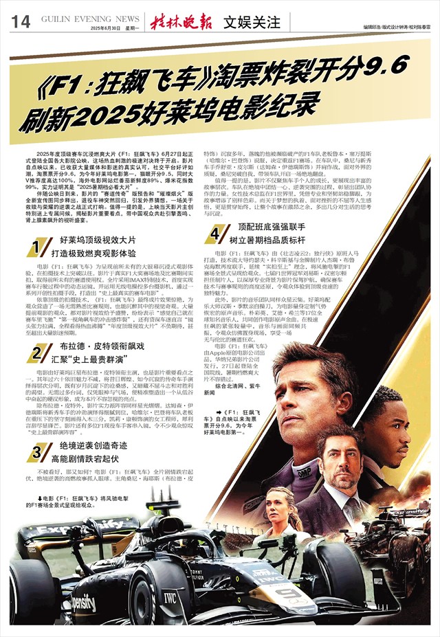 刷新2025好莱坞电影纪录   2025年度顶级赛车沉浸燃爽大片《F1:狂飙飞车》6月27日起正式登陆全国各大影院公映,这场热血刺激的极速对决终于开启。影片自点映以来,已收获大量媒体和影迷的真实认可,社交平台好评如潮,淘票票开分9.6,为今年好莱坞电影第一,猫眼开分9.5,同时大V推荐度高达100%,海外电影网站烂番茄新鲜度89%、爆米花指数99%,实力证明其是“2025暑期档必看大片”。