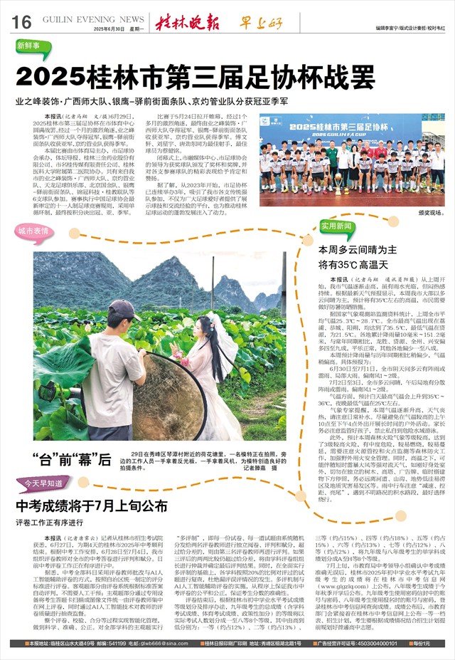 中考成绩将于7月上旬公布 评卷工作正有序进行   本报讯(记者唐霁云)记者从桂林市招生考试院获悉,6月27日,为期4天的桂林市2025年中考顺利结束。根据中考工作安排,6月28日至7月4日,我市组织评卷教师对全市的中考答卷进行评判和赋分。目前中考评卷工作正在有序进行中。