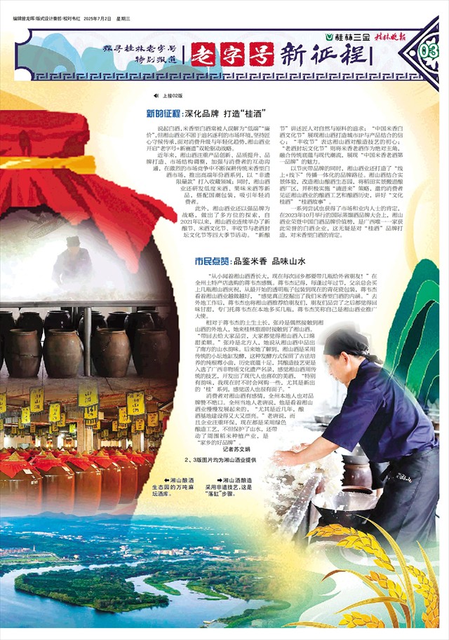 相对于蒋韦杰的土生土长,张玲是偶然接触到湘山酒的外地人,她来桂林旅游时接触到了湘山酒。“带回去给大家品尝,大家都觉得湘山酒入口绵甜柔顺。”张玲是北方人,她说从湘山酒中品出了南方的山水韵味。后来她了解到,湘山酒是采用传统的小坛地缸发酵,这种发酵方式保留了古法培养的纯根霉小曲,历史底蕴十足,其酿造技艺更是入选了广西非物质文化遗产名录,感觉湘山酒用传统的技艺,开发出了现代人也喜欢的美酒,“特别有韵味,我现在时不时会网购一些,尤其是新出的‘桂’系列,感觉送人也很有面子。”