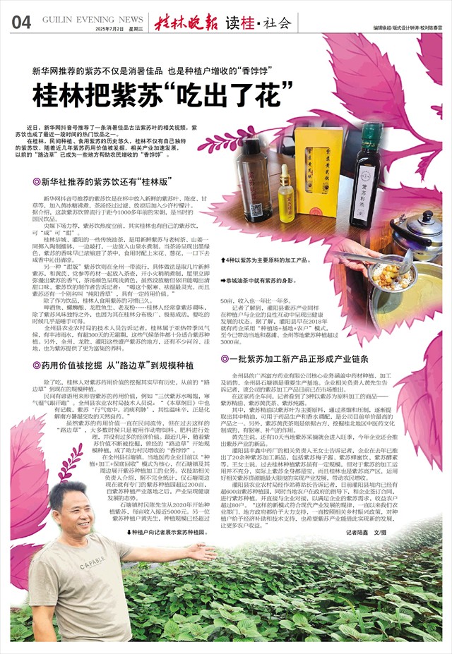 在桂林,民间种植、食用紫苏的历史悠久,桂林不仅有自己独特的紫苏饮,随着近几年紫苏药用价值被发掘,相关产业加速发展,以前的“路边草”已成为一些地方帮助农民增收的“香饽饽”。