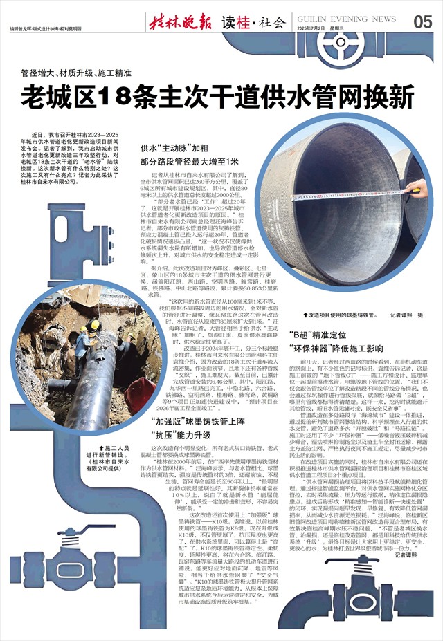 这次改造还首次使用上“加强版”球墨铸铁管——K10级。袁维说,以前桂林使用的球墨铸铁管为K9级,现在升级成K10级,不仅管壁厚了,抗压程度也更高了,在供水系统里面,可以算得上是“高配”了。K10的球墨铸铁管稳定性、柔韧度、延展性更高,将在六合路、滨江路、瓦窑东路等车流量大路段的机动车道进行铺设,能更好应对地面沉降、地震等风险,相当于给供水管网装了“安全气囊”。“K10的球墨铸铁管极大提升管网系统适应复杂地质环境能力,从根本上保障城市供水系统今后运营稳定和安全,为城市基础设施提质升级筑牢根基。”