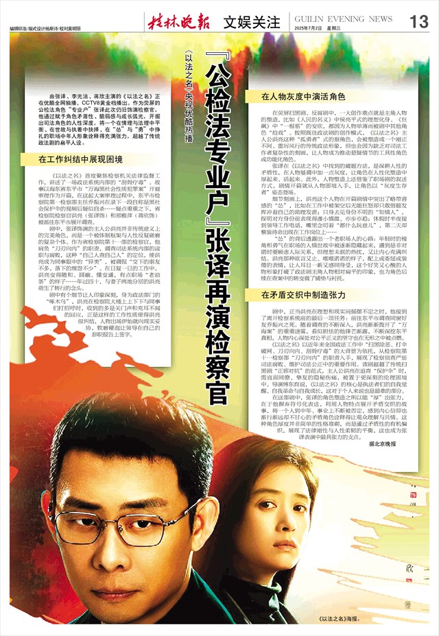 由张译、李光洁、蒋欣主演的《以法之名》正在优酷全网独播,CCTV8黄金档播出。作为荧屏的公检法角色“专业户”张译此次仍旧饰演检察官,他通过赋予角色矛盾性、脆弱感与成长弧光,开掘出司法角色的人性深度,将一个在情理与法理中平衡、在世故与执着中抉择、在“怂”与“勇”中挣扎的职场中年人形象诠释得充满张力,超越了传统政法剧的扁平人设。