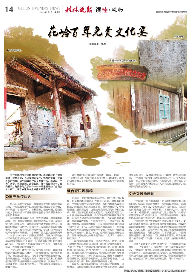 在广西临桂义江河畔的花岭村,两块斑驳的“学堂田碑”静默矗立,其上模糊的文字,悄然诉说着一个百年前的传奇:这个四百余户的百家姓村落,竟通过“学田”养学、戏台义演、文会包揽,让村民免费读书、免费看戏、免费参与文学创作——一场逾百年的“免费文化大餐”,早已在这方水土滋养着两千乡民。