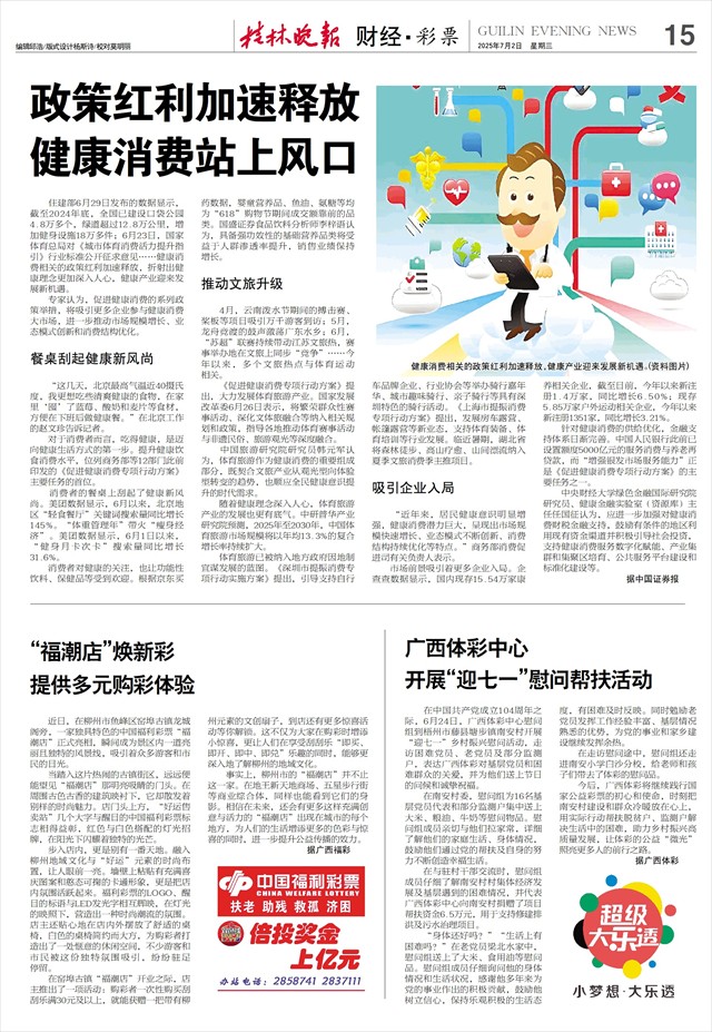 住建部6月29日发布的数据显示,截至2024年底,全国已建设口袋公园4.8万多个,绿道超过12.8万公里,增加健身设施18万多件;6月23日,国家体育总局对《城市体育消费活力提升指引》行业标准公开征求意见……健康消费相关的政策红利加速释放,折射出健康理念更加深入人心,健康产业迎来发展新机遇。