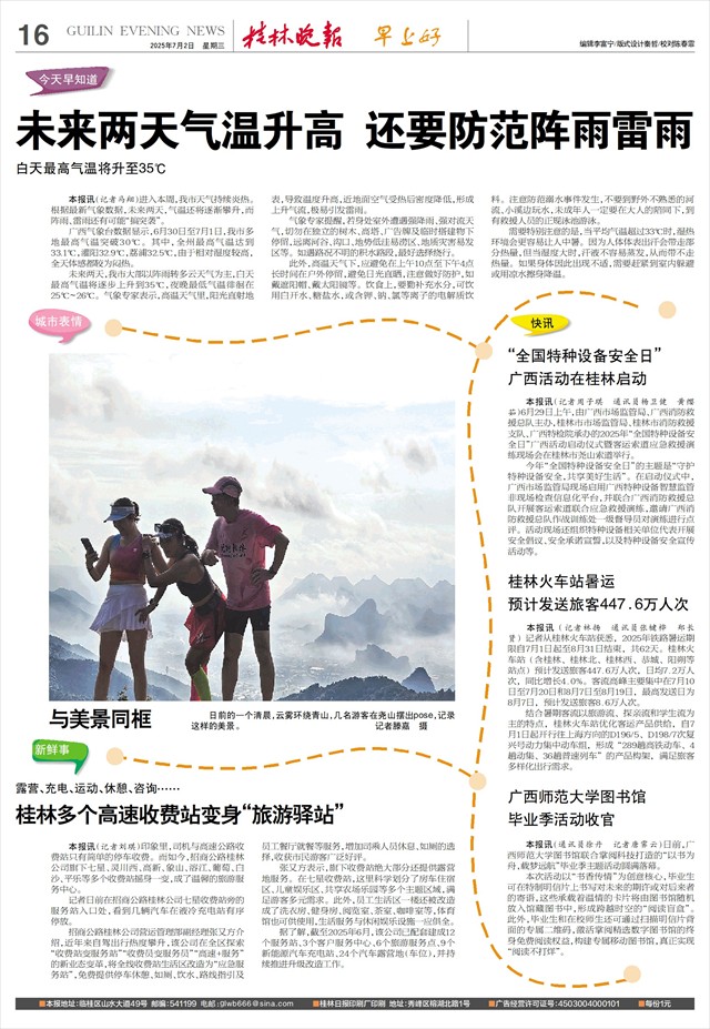 招商公路桂林公司营运管理部副经理张又方介绍,近年来自驾出行热度攀升,该公司在全区探索“收费站变服务站”“收费员变服务员”“高速+服务”的新业态变革,将全线收费站生活区改造为“应急服务站”,免费提供停车休憩、如厕、饮水、路线指引及员工餐厅就餐等服务,增加司乘人员休息、如厕的选择,收获市民游客广泛好评。