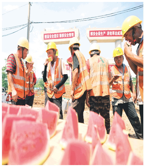 7月3日,在山东省临沂市沂南县铜井镇董梁高速第四标段施工现场,工人们在休息区吃西瓜解暑。