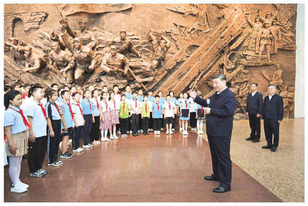 在纪念馆大厅,习近平同前来参观的青少年学生和纪念馆工作人员亲切交流。他说,88年前的今天发生的“七七事变”,是中华民族全面抗击日本侵略者的起点,前事不忘、后事之师,到这里来就是接受精神洗礼。广大青少年生逢其时,要赓续红色血脉,树立强国有我的远大志向,做堂堂正正、光荣自豪的中国人,勇担民族复兴的时代大任。