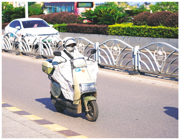 这两天桂林又闷又热,市气象台发布了高温橙色预警信号,外出的市民在防晒上下足了功夫。图为7日下午,一位市民骑电动车经过漓江桥,安全头盔、防晒衣、口罩、防晒被把整个人遮挡得严严实实,全力防晒。 记者邢刚 摄