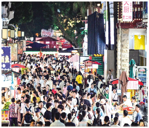 暑假来临,来桂林旅游的游客越来越多。7月7日晚,在桂林正阳步行街,游人络绎不绝,享受着夜游的独特魅力。 记者滕嘉 摄