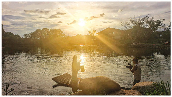 近日,夕阳西下时,在穿山公园小东江上,一位游客拍摄“武侠风”的照片。记者滕嘉 摄