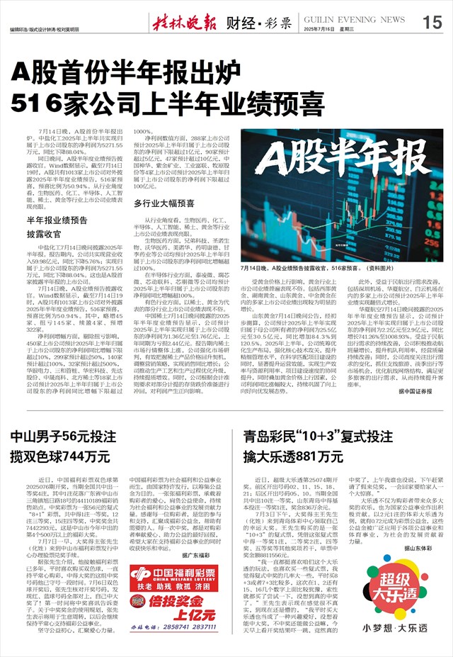 同日晚间,A股半年度业绩预告披露收官。Wind数据显示,截至7月14日19时,A股共有1013家上市公司对外披露2025年半年度业绩预告,516家预喜,预喜比例为50.94%。从行业角度看,生物医药、化工、半导体、人工智能、稀土、黄金等行业上市公司业绩表现亮眼。