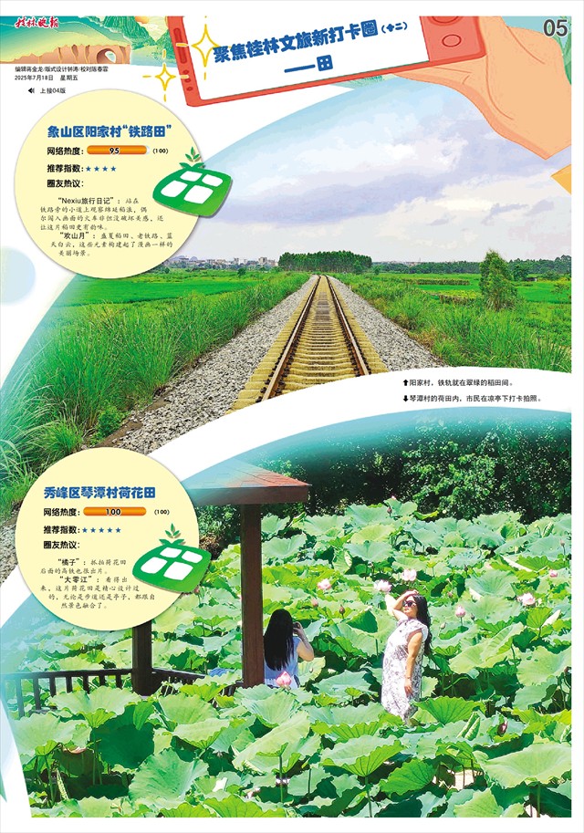 同样因“田”出圈的还有位于象山区茶店路的阳家村。成片的水稻在夏日阳光中茁壮成长,在这片绿色的画布上,一条铁路“画”出了笔直的一条线。走在这里的田间小路上,不时能看到几只蜻蜓在稻苗上歇脚。站在铁路与田间步道交会的路口远眺,笔直的铁轨和两侧翠绿的稻田一起消失在远处的地平线,这个场景令人印象深刻。