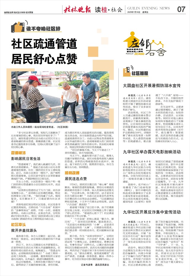 “多亏社区牵头协调,短短几天就解决了污水堵塞的烦心事,现在居住环境好多了!”近日,漓东街道空明社区市政小区居民王女士看着畅通的排水管道,难掩感激之情。社区党委书记夏改青多方协调,仅用4天便化解了这个居民烦心事。