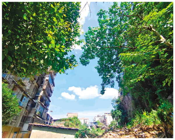 马鞍山(右)有一部分山体在居民小区里,需要特别注意山体安全。 记者苏文娟 摄