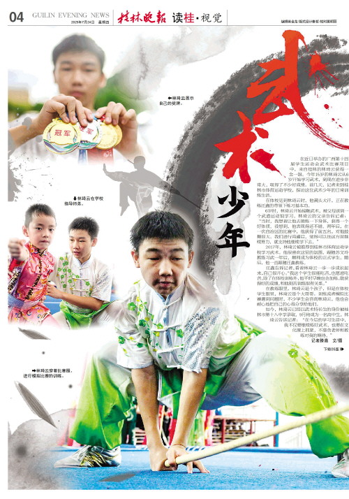 武术少年   在近日举办的广西第十四届学生运动会武术比赛项目中,来自桂林的林琦云获得一金一银。前几天,记者来到桂林市体育运动学校,探访这位武术少年的日常训练生活。