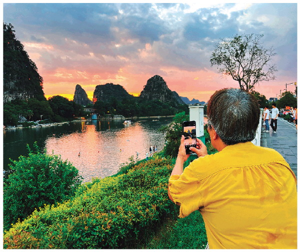 7月29日傍晚,桂林的天空出现迷人晚霞。彼时,夕阳的余晖与天边的云朵交织共舞,将天空渲染得五彩斑斓。一位市民恰好行至临江路,被这如诗如画的美景深深吸引,赶忙拿出手机进行拍摄。 记者邢刚 摄