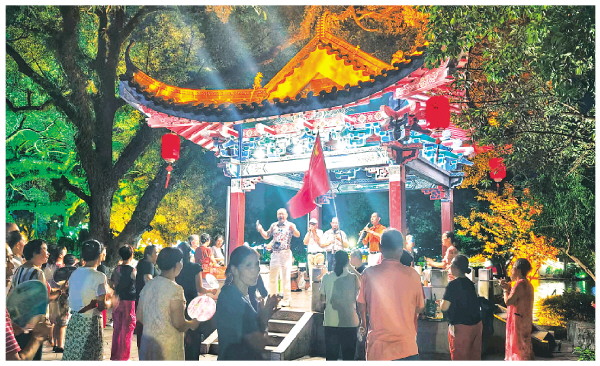 近日的一个夜晚,在两江四湖景区,一群市民唱歌和演奏,并不时与来往的市民游客互动,展现桂林人的活力与热情。 记者滕嘉 摄