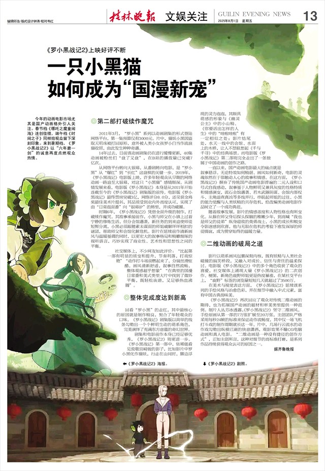 如何成为“国漫新宠”   今年的动画电影市场尤其是国产动画格外引人关注。春节档《哪吒之魔童闹海》连创佳绩,端午档《时间之子》同样给观众留下深刻印象。来到暑期档,《罗小黑战记2》以“六年磨一剑”的诚意再度点燃观众热情。