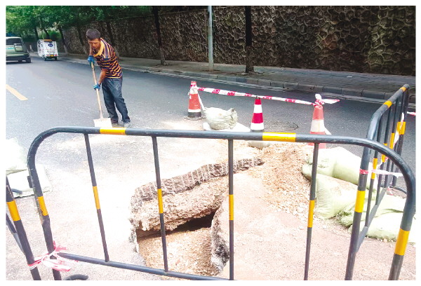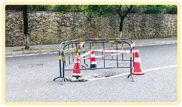 社区热心群众在塌陷的路面周围设置了护栏和锥形筒。(社区供图)