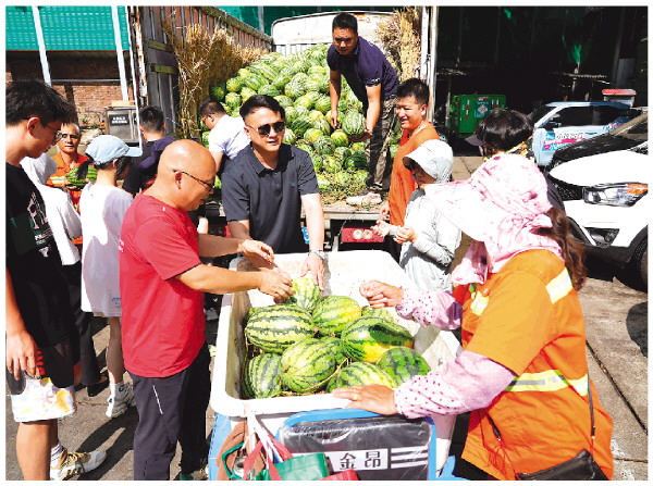 8月2日,20多名热心市民和志愿者自发组织,筹集了约2万斤西瓜,给七星区和灵川县的环卫工人送清凉。图为当天上午,热心市民和志愿者将西瓜从货车上卸下,送给七星区环卫站的环卫工人,感谢他们每天的奉献和付出。记者邢刚 摄