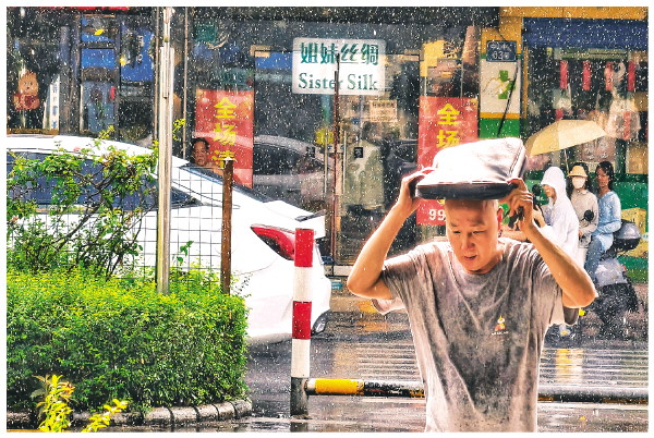挡雨 3日下午,一场突如其来的大雨造访我市。中山中路一斑马线上,一市民正在过马路,他下意识地将手中的公文包举过头顶遮挡雨水。 记者滕嘉 摄