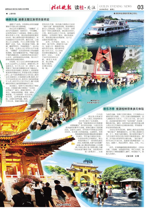 进入8月,暑期已经过半。假期里的桂林各景区景点游人如织,热闹氛围浓厚。我市文旅部门精心策划,推出了一系列丰富多彩的福利和活动,各景区推出新项目,为五湖四海的游客和广大市民送上精彩纷呈的“文旅大餐”。